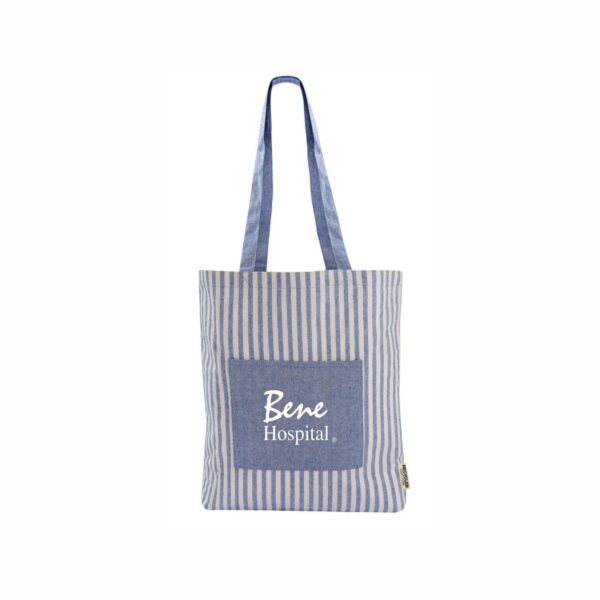 Bolsa ecológica de algodón reciclado. Sin fuelle. Incluye bolsillo frontal. Estampado de rayas.